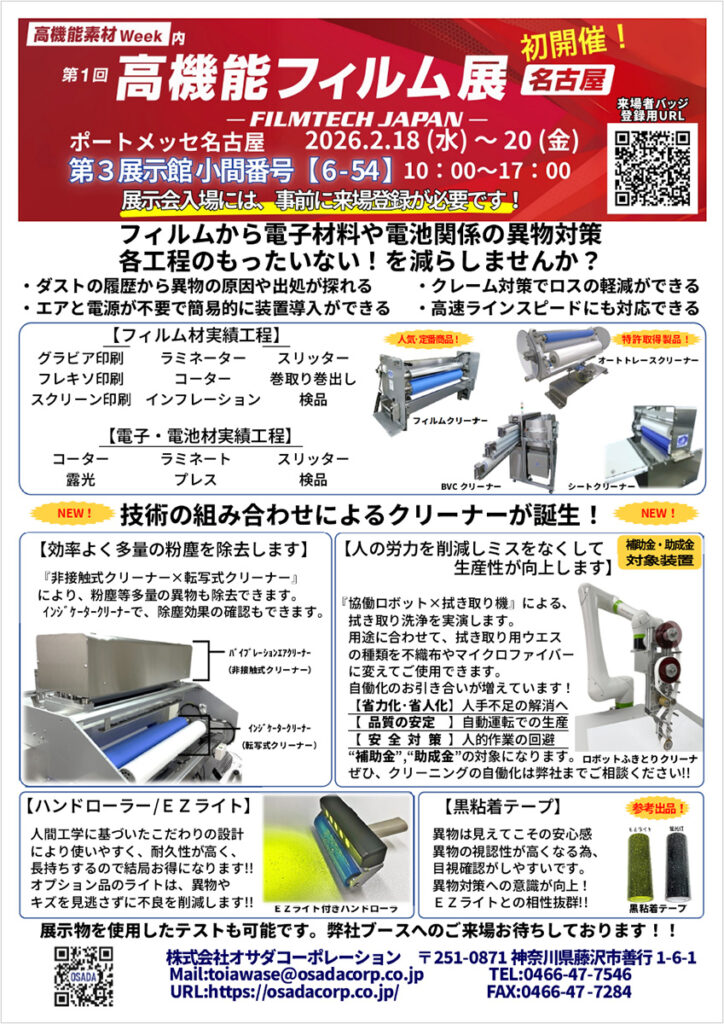 展示会:【名古屋】第1回 高機能フィルム展(FILMTECH JAPAN) 期 間:2026.2.18(水)~ 20(金) 10:00~17:00 会 場:ポートメッセ名古屋 第3展示館 小間番号[6-54]